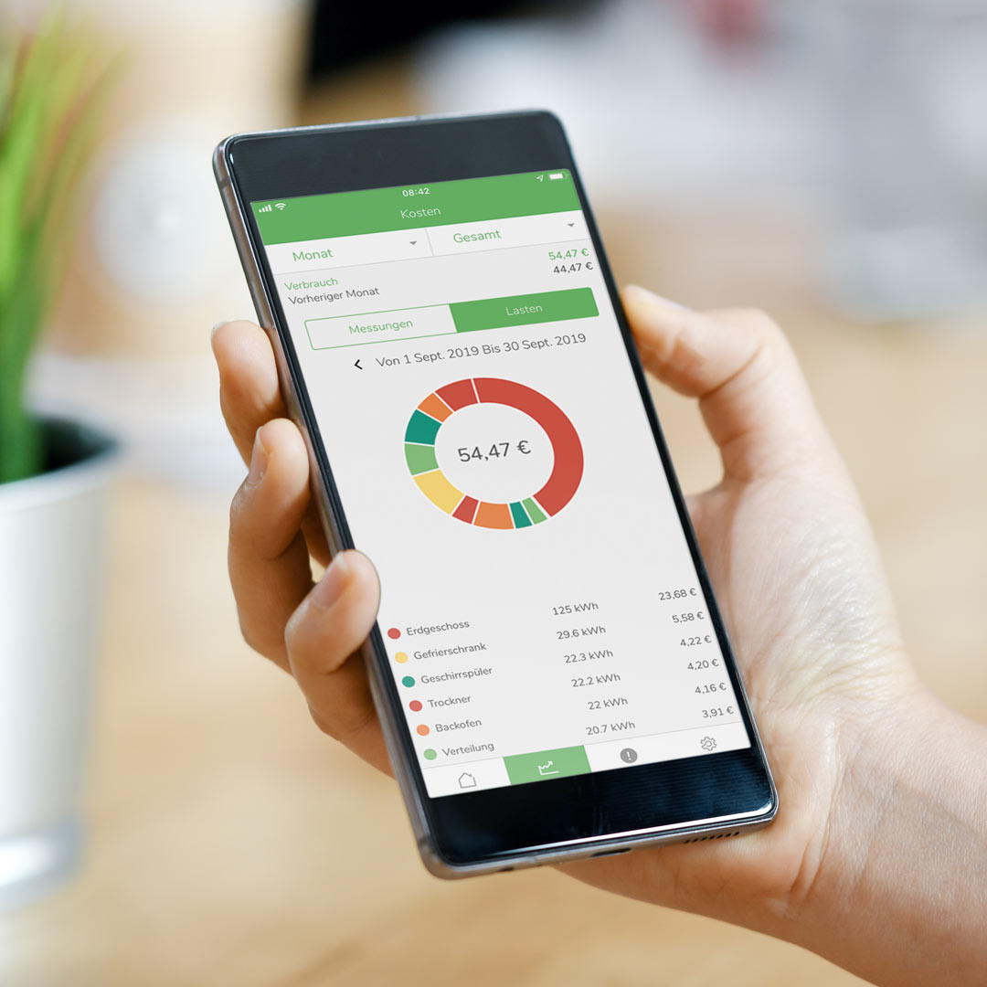 Für einen langfristigen Überblick kannst du den Energieverbrauch mehrerer Monate vergleichen und die zugehörigen Kosten im Auge behalten. Per App überblickst du alle erfassten Energieverbräuche im Detail.