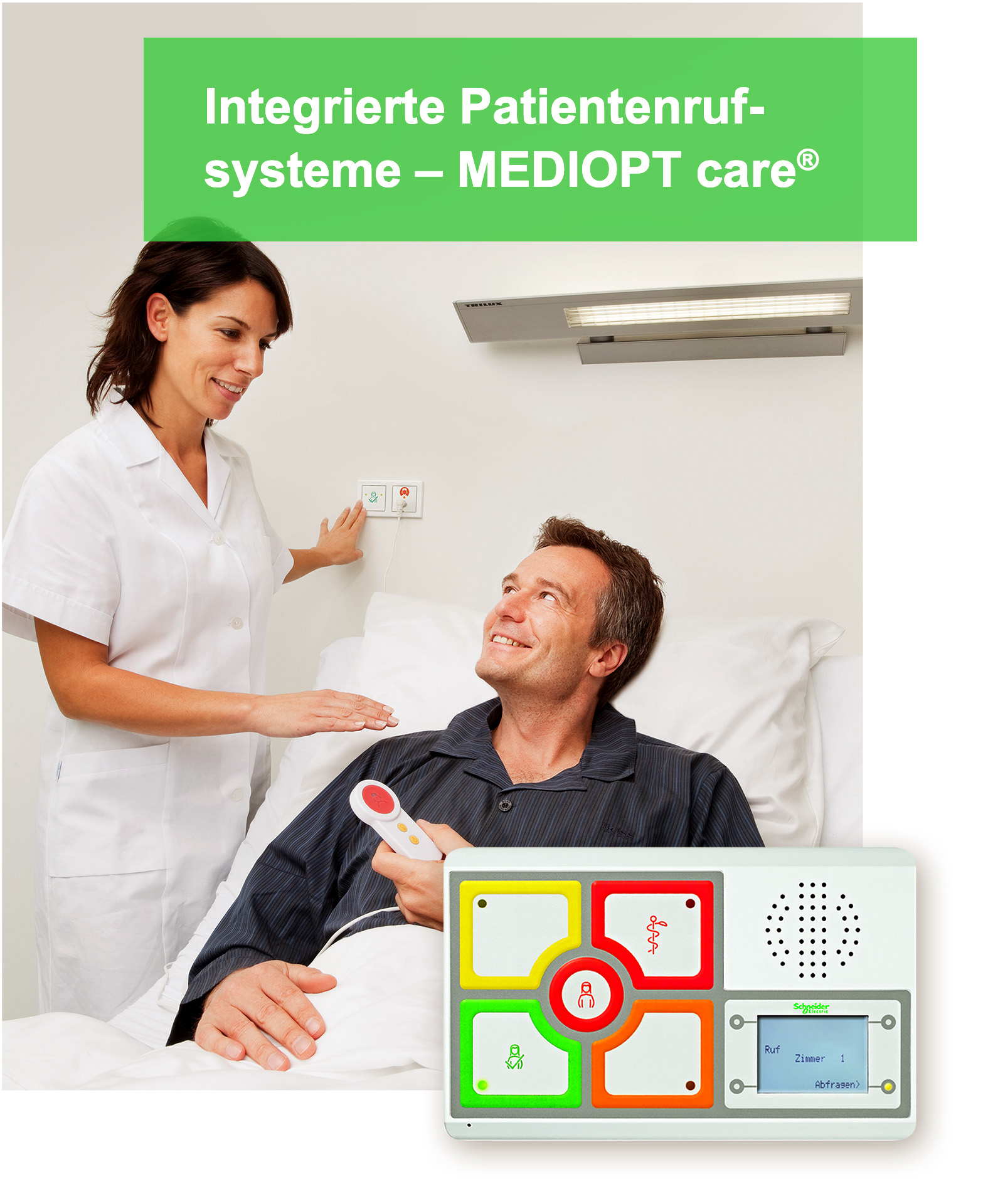 Schnell auf Patientenwünsche reagieren – in der Pflege aus Zeitmangel nicht immer möglich. Mit MEDIOPT care® haben wir die Lösung. Unser DIN VDE 0834 zertifiziertes Patientenrufsystem mit integrierter Sprachfunktion ermöglicht es jederzeit flexibel miteinander zu kommunizieren und auf die individuellen Bedürfnisse einzugehen. Das Ergebnis: mehr Zufriedenheit bei Personal und Bewohnern.