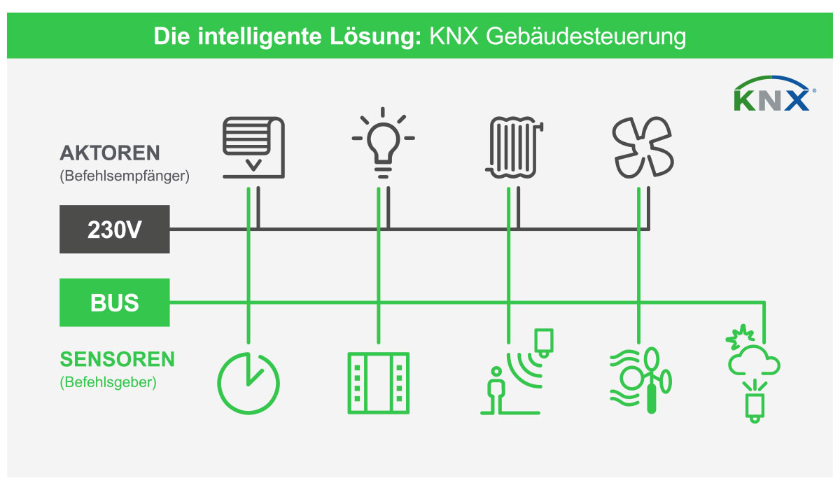 Bei KNX sind alle Geräte an eine gemeinsame Busleitung (2adrig) angeschlossen, die parallel zum Stromkreis verlegt wird. Jedes Gerät ist in der Lage, mit allen anderen zu kommunizieren. Wenn ein Sensor aktiviert wird, führt der Aktor die gewünschten Befehle aus. Alle Funktionen können parametriert und ständig erweitert werden, ohne weitere Anpassungen am Gebäude vorzunehmen.