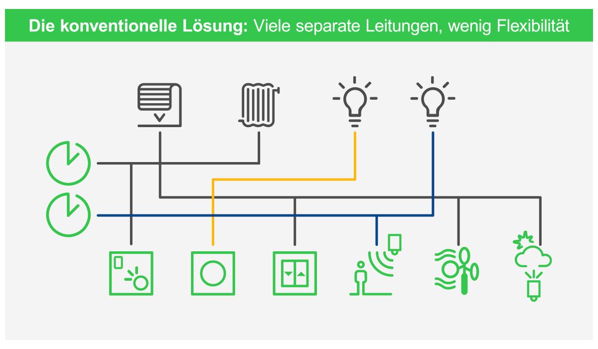 Bei konventionellen Lösungen in der Haus- oder Büroelektronik vertraust du auf viele separate Leitungen, die nicht miteinander verkabelt sind und daher nicht miteinander interagieren können.
