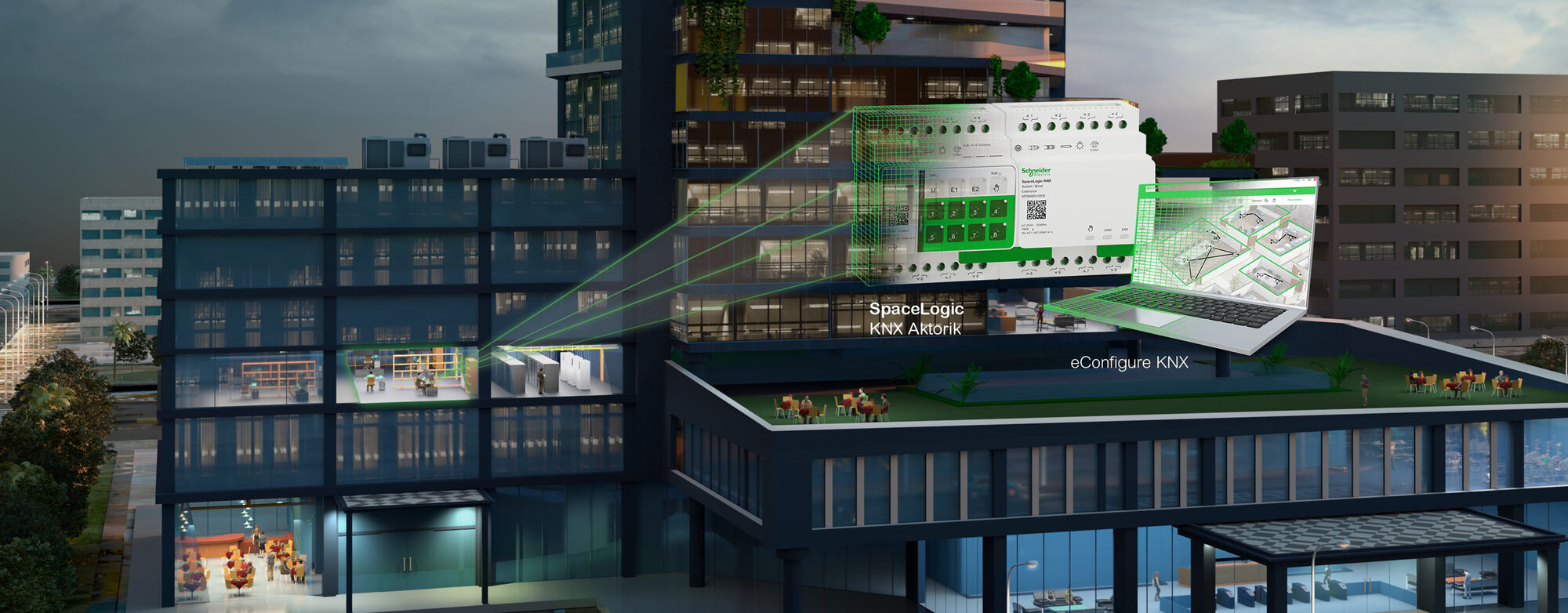 Eine einfache Lösung, Wohnhäuser und Gewerbekomplexe mit smarten Steuerungen für Beleuchtungs-, Beschattungs- und HKL-Systeme auszustatten: eConfigure KNX Lite von Schneider Electric. Für smarte Häuser und Gewerbegebäude.