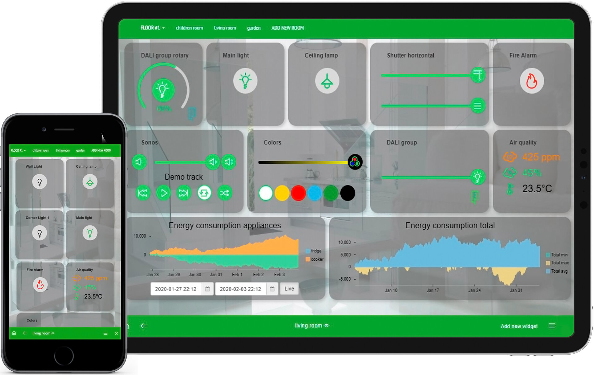 Alle Gebäudefunktionen können auch von unterwegs aus gesteuert und überwacht werden. Alles, was Sie benötigen, ist ein Internetanschluss und ein Smartphone oder Tablet.