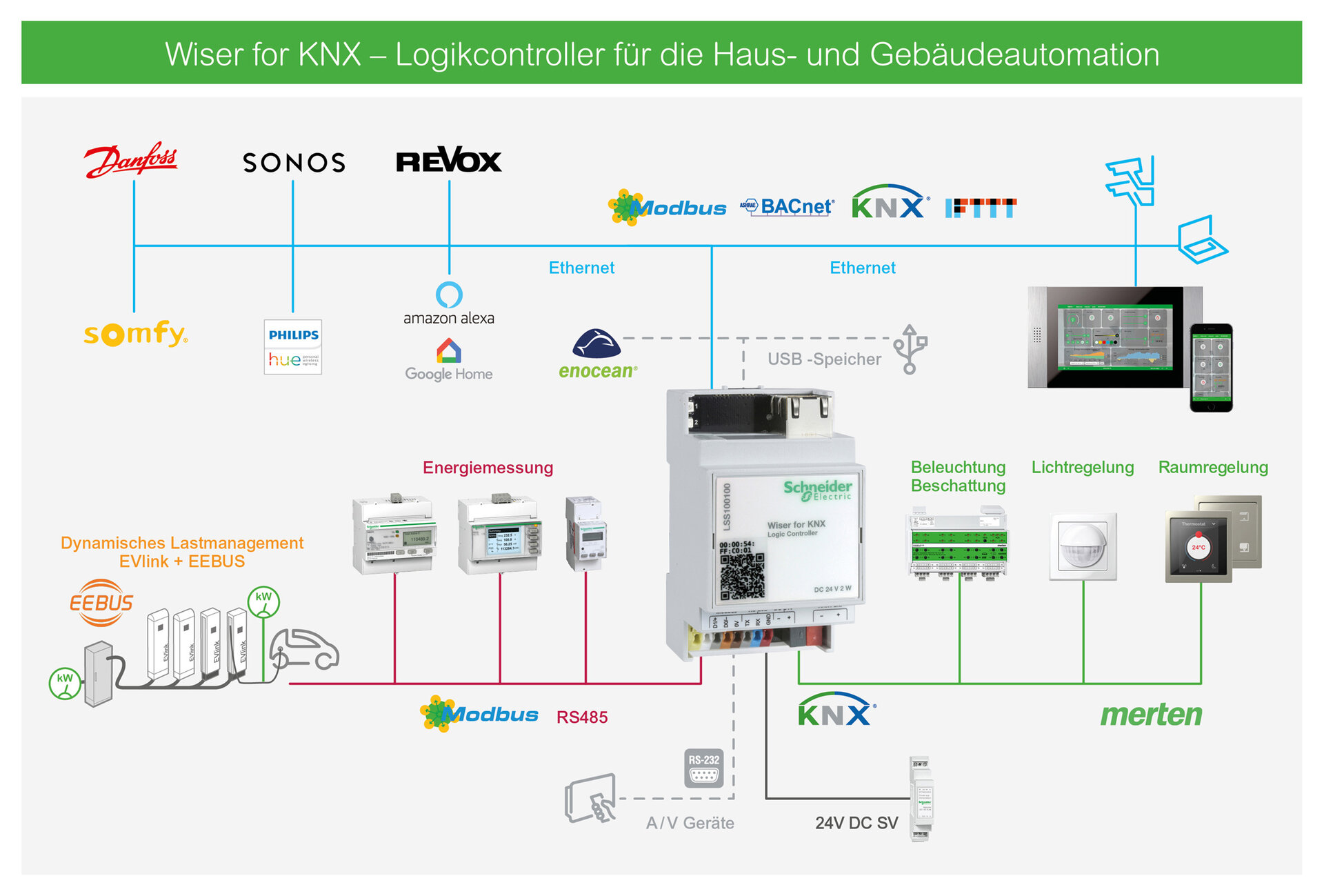 IoT (Internet of things) spielt eine immer größere Rolle. Doch worüber sprechen wir, wenn wir IoT sagen? Ganz einfach gesagt handelt es sich, um Dinge die über das Internet miteinander vernetzt sind. Wiser™ for KNX und spaceLYnk von Schneider Electric sorgen für die Verbindung der verschiedenen Standards und Protokolle, sodass alle Anwendungen in der Haus-und Gebäudeautomation und des Energiemanagements nur eine Schnittstelle benötigen. Das heißt durch das einsetzten von Wiser™ for KNX und spaceLYnk sparen Sie sich die USB Schnittstelle, IP-Router, Logik Modul aber auch die Jahreszeitschaltuhr.
