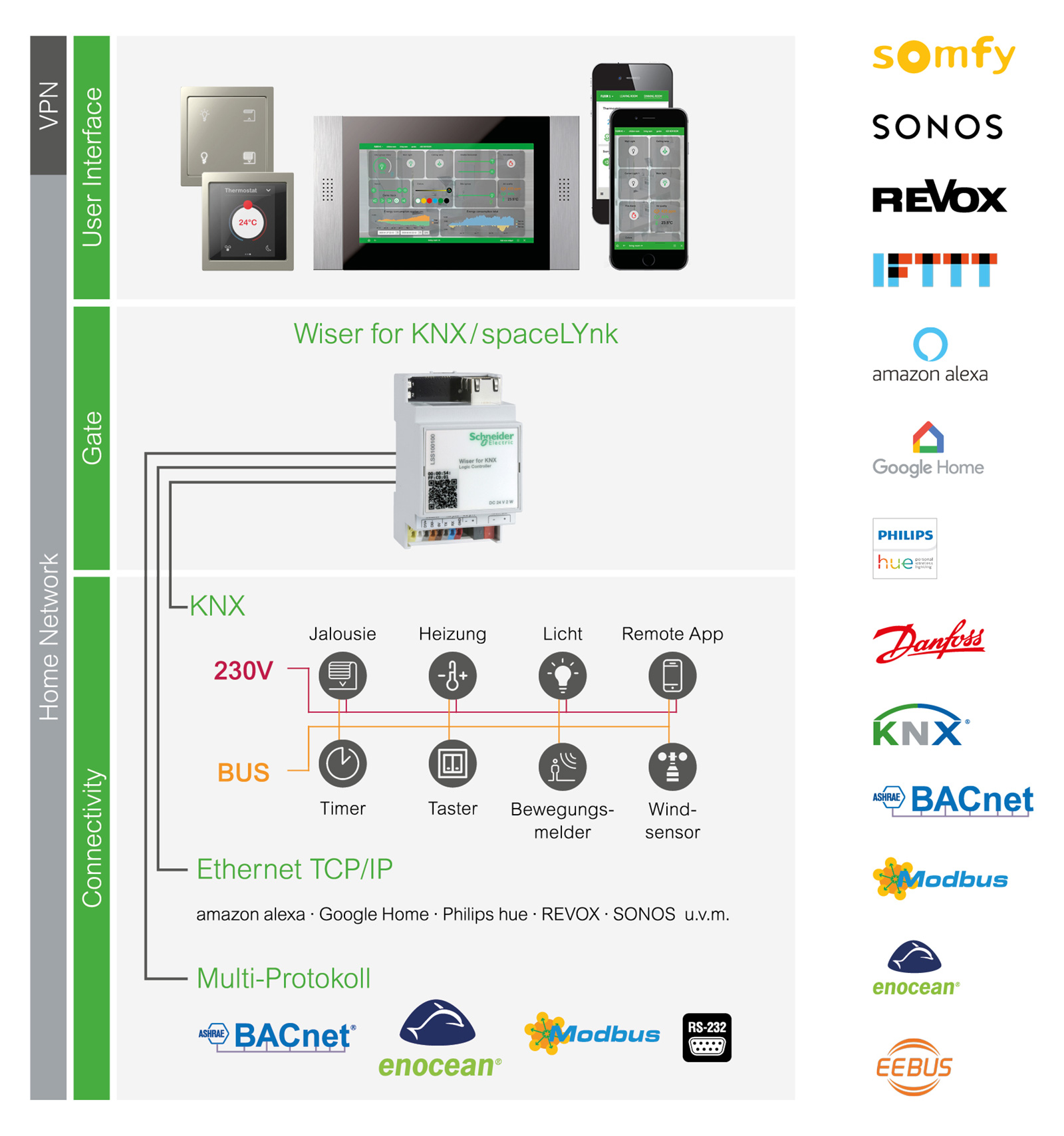 Der Wiser for KNX ™ / spaceLYnk verbindet unterschiedliche Protokolle und Dienste mit der KNX-Welt und setzt neue Maßstäbe in der Erstellung von Visualisierungslösungen. Hiermit erfüllen Sie alle Anforderungen Ihrer Kunden.