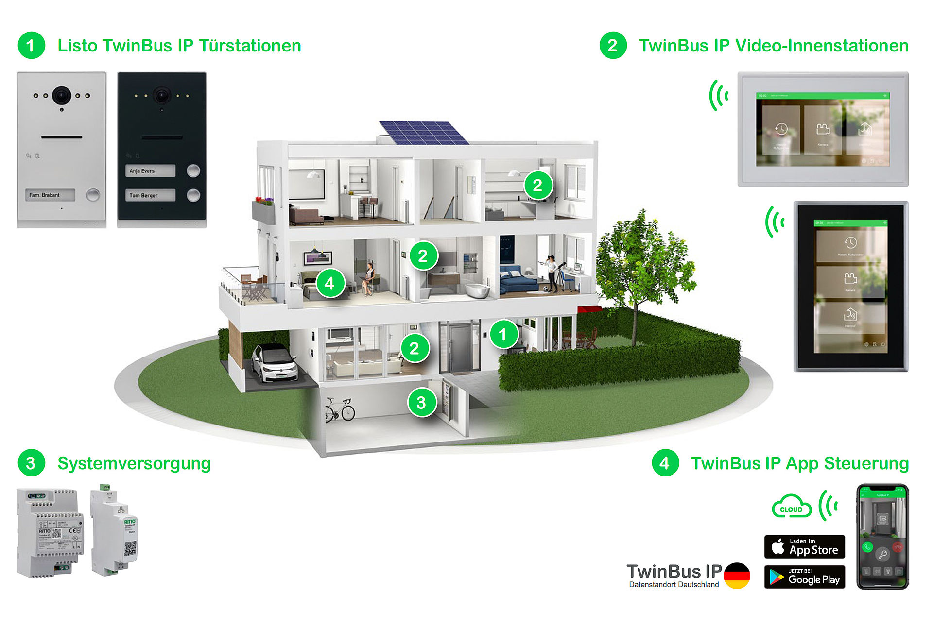 Die Türkommunikation in einem smarten Haus auf ein digitales Level zu heben, gelingt mit ganzheitlichen, vorkonfigurierten Lösungen wie den neuen Listo TwinBus IP Sets besonders leicht. Jedes Set enthält: