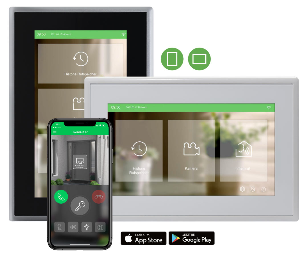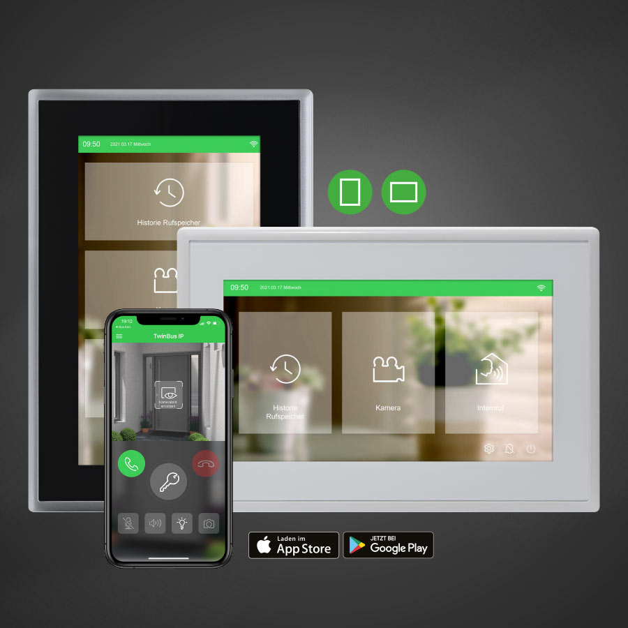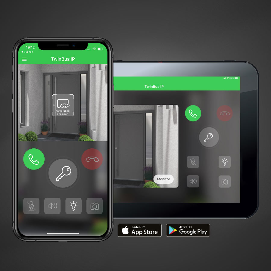 Die TwinBus IP Video-Türsprechanlagen umfassen eine Türstation, die außen neben der Haustür angebracht wird und als Klingel fungiert. Ergänzt wird die Türstation durch eine oder mehrere Innenstationen, die als Sprechstellen dienen. Darüber finden die Bedienung der Station und die Türkommunikation statt – alternativ steht hierfür jedoch auch das eigene Smartphone zur Verfügung. In der TwinBus IP App für iOS und Android können sämtliche Funktionen bedient und Einstellungen vorgenommen werden. Für den besonders leichten Einbau sind auch vollständige Sets verfügbar, die jeweils eine Türstation und eine Innenstation enthalten.