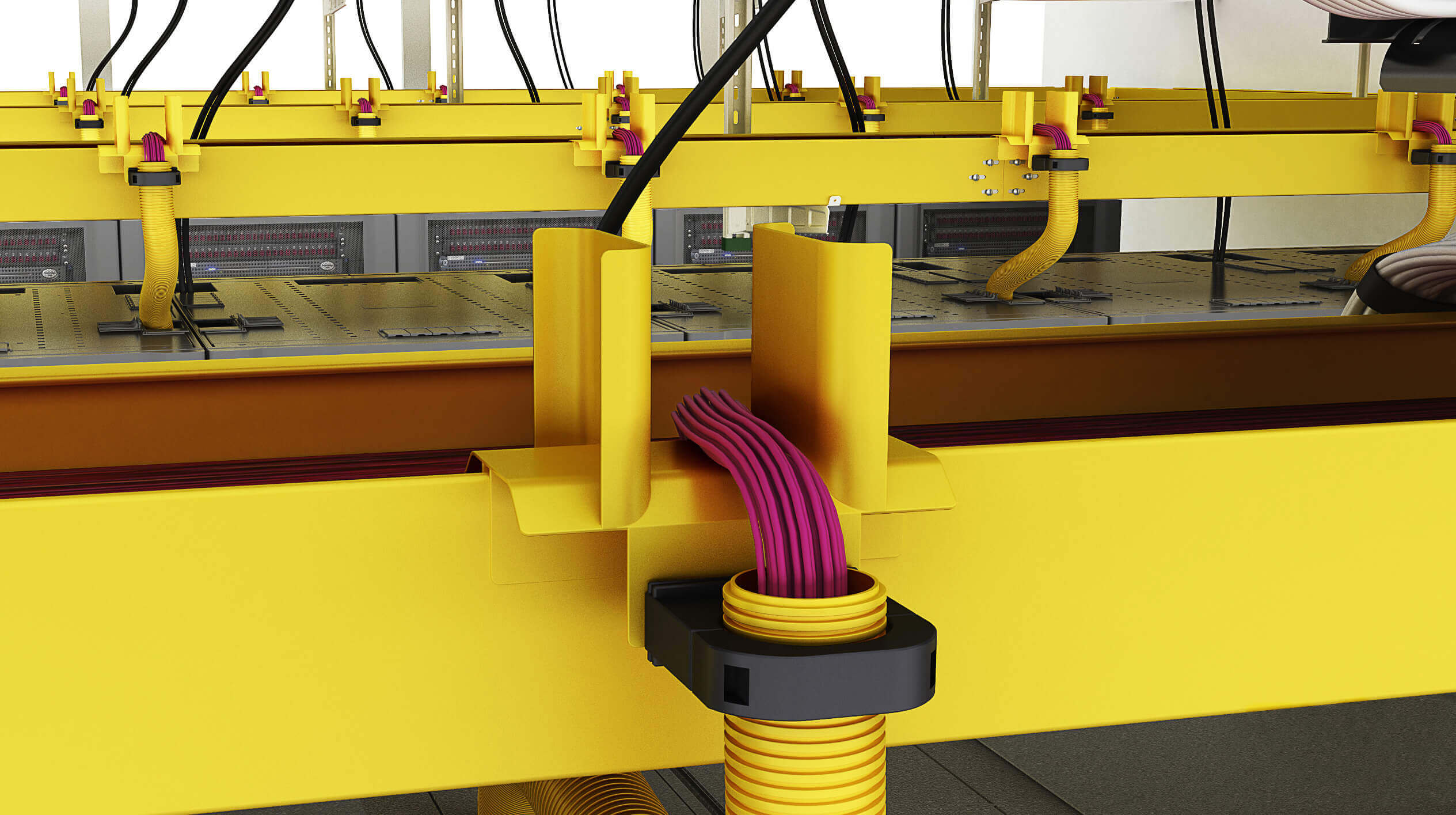 Das Schneider Electric System unterstützt Kanalhöhen von 60 und 110 mm und ist in den Breiten von 100, 200 oder 300 mm in der Farbe Gelb (RAL1023) erhältlich. Robuste Stahlschienen ermöglichen lange Stützweiten von bis zu drei Metern ohne Durchbiegung. Abdeckungen und Mini-Patches lassen sich schnell und einfach ohne Werkzeugeinsatz verklipsen. Offene Konsolen für das Kabelmanagement erlauben außerdem eine schnelle Kabelanbindung und reduzieren gleichzeitig den Arbeitseinsatz für Installationen, Erweiterungen und Nachrüstungen. Kabelrinnen, Kreuzungs- Reduzier- und Steigelemente sowie Abgänge sind komplett in das System integriert, flexibel variierbar und dabei immer passgenau.