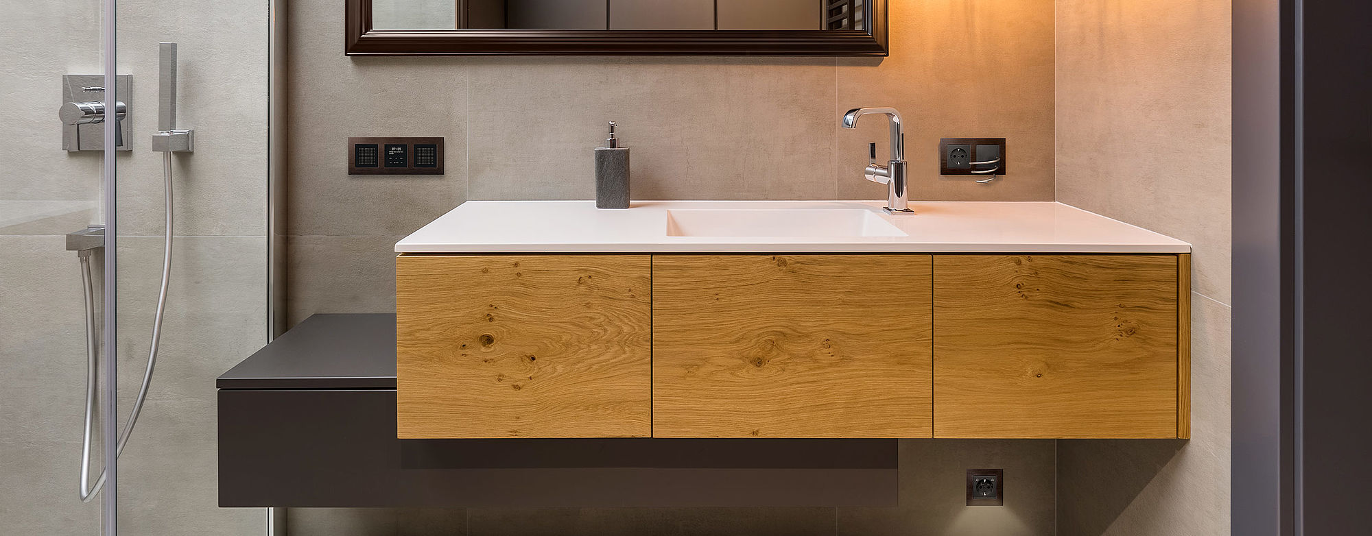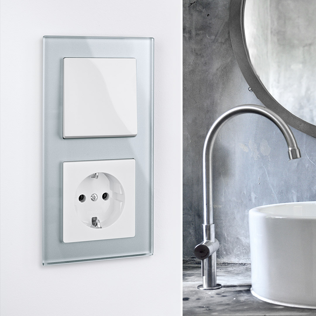 Ob Glas, Metall oder Stein – unsere vielseitigen Schalter und Steckdosen aus natürlichen Echtmaterialien integrieren sich in jedes Badezimmer-Interieur und bereichern deine Wohlfühloase um stilvolle Akzente. Zusätzlicher Pluspunkt: die leichte Reinigung der Oberflächen.
