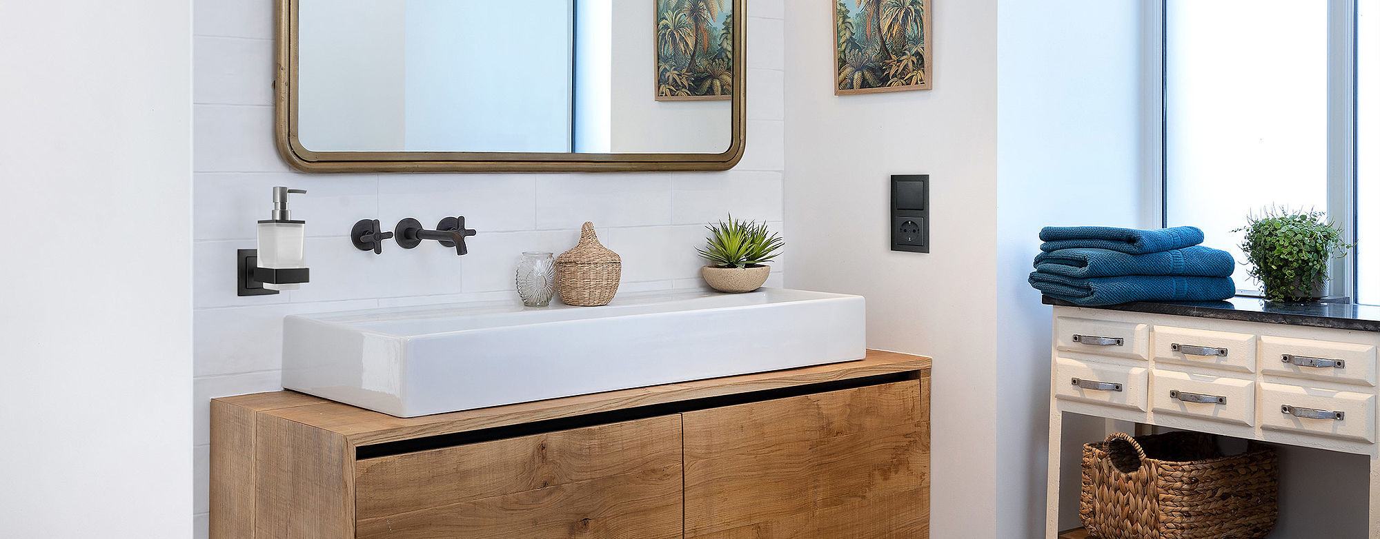 Dank vielfältiger Materialien, facettenreicher Formen und einer breiten Farbpalette fügt sich System M in jedes Raumambiente ein. Für ein harmonisches Einrichtungskonzept und durchgängiges Schalterdesign, das in deinem Gäste-WC nicht endet.