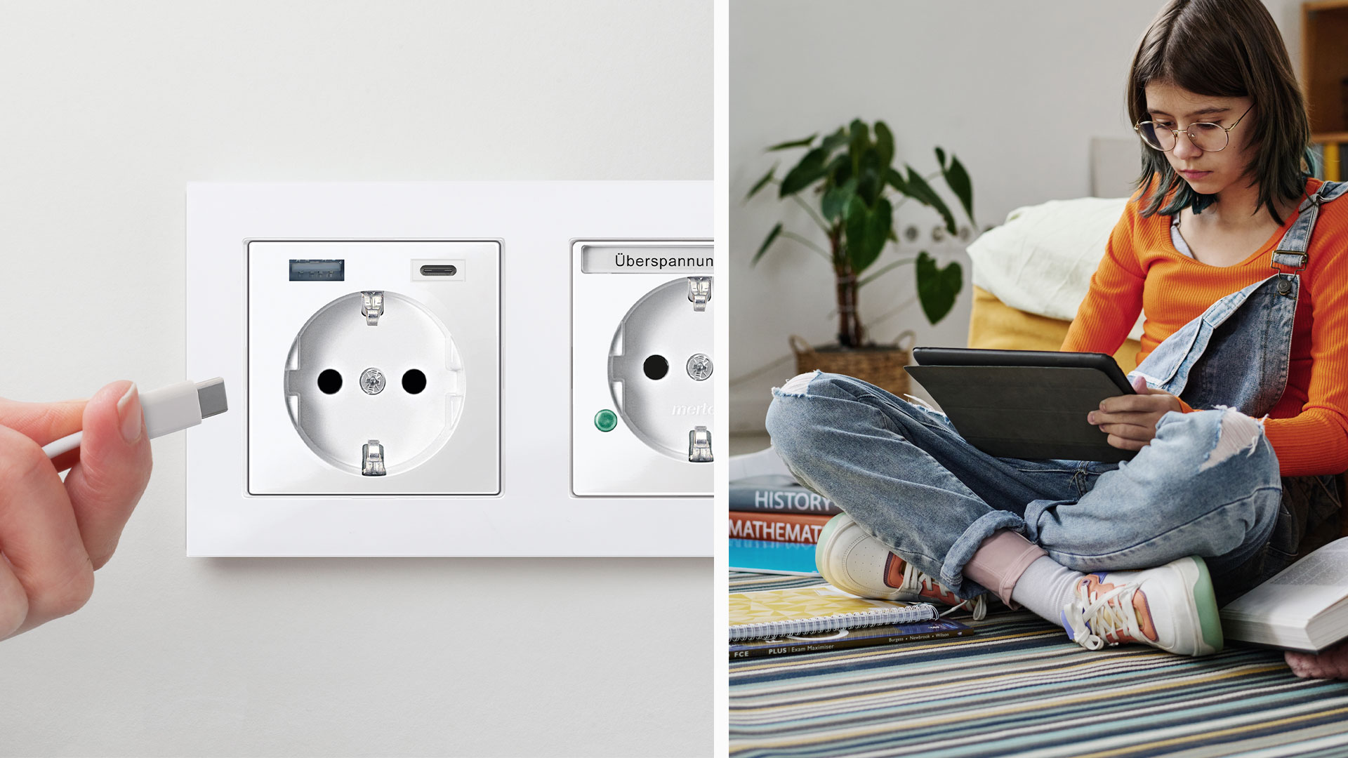 Deine Garantie für einsatzbereite Mobilgeräte: die SCHUKO-Steckdose mit integrierter USB-Spannungsversorgung. Denn am USB-Typ-A- oder Typ-C-Anschluss kannst du Smartphone, Smartwatch und Bluetooth-Box jederzeit und ganz ohne Netzteil aufladen.